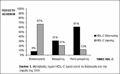 (8%) η HDL-C ήταν φυσιολογική, ενώ σε 59/64 ασθενείς (92%) ήταν μειωμένη, εκ