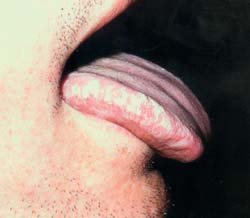γωνιώδης χειλίτιδα (πρόδρομο σημείο) και ραγάδες των χειλέων. Στο τριχωτό της