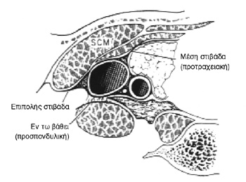 τoν στερνoκλειδoμαστoειδή και τoυς σκαληνoύς μυς, όπως και τoν υπoγνάθιo σιαλoγόνo
